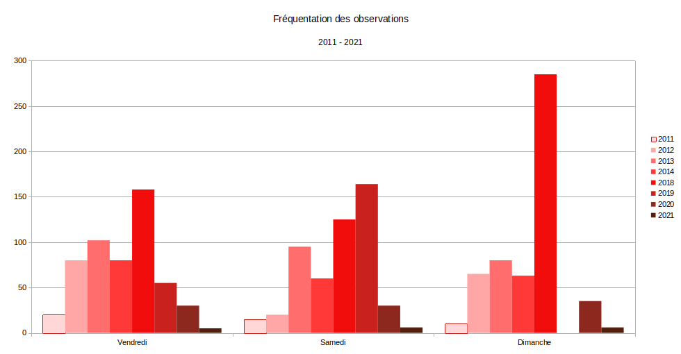 Le bilan de cette édition 2021 est mitigé. La fréquentation est en baisse, essentiellement affectée par les trois soirs couverts sans observation le vendredi, samedi et le dimanche. L’entrée en vigueur du passe sanitaire deux semaines avant le début du Festival nous a forcé à changer les conditions d’accès et de visite de l’exposition et des conférences.
